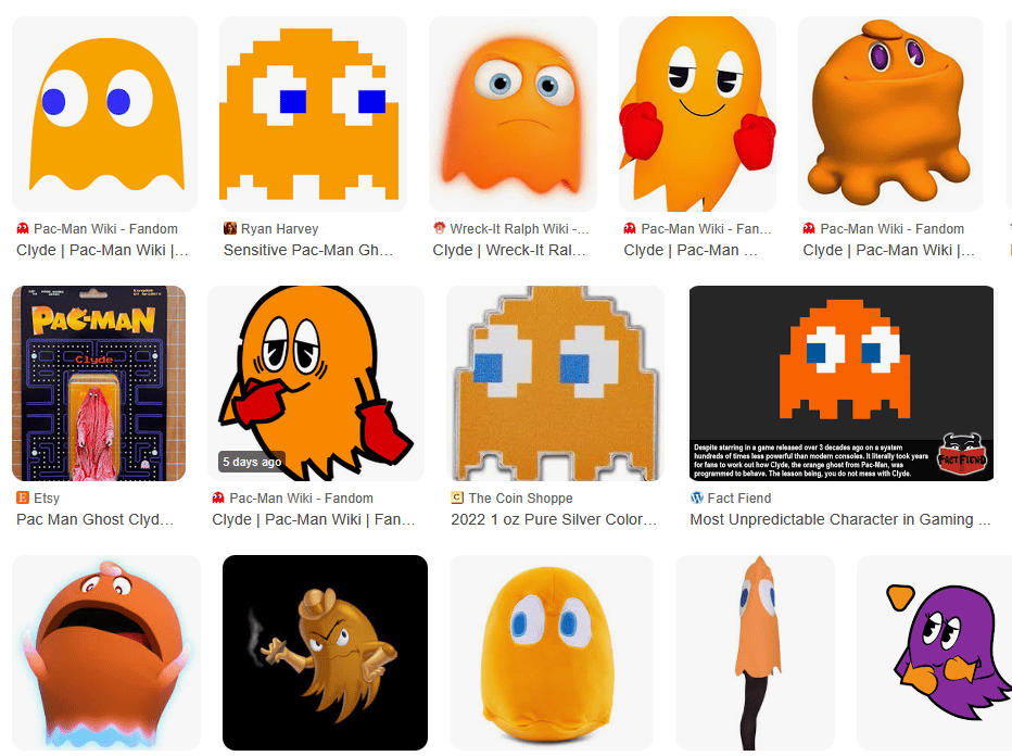 25D. What did you think the name of [The orange Pac-Man ghost (the others are named Blinky, Pinky, and Inky)] was? Clinky? Finky? Good guesses, but CLYDE, the business-focused no-jokes ghost, wonders why you’d think he has such a silly name just because his colleagues do. Here’s a menagerie of official and unofficial art of “The Most Unpredictable Character in Gaming.” My favourite is the very good Clyde costume in the bottom right.